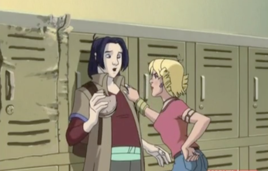 In the school, Tabby can't get her locker open, so she "booms" it open. Then she realizes that it's not her locker at all. Kurt comes up behind her and says that she's not supposed to be using her powers. They argue over Xavier's punishment. Then she snatches his "burger bomb" and his social studies book (both without really asking) and takes off. Kurt stands there with a sappy look on his face until Evan shows up to tell him he's late for chemistry.
