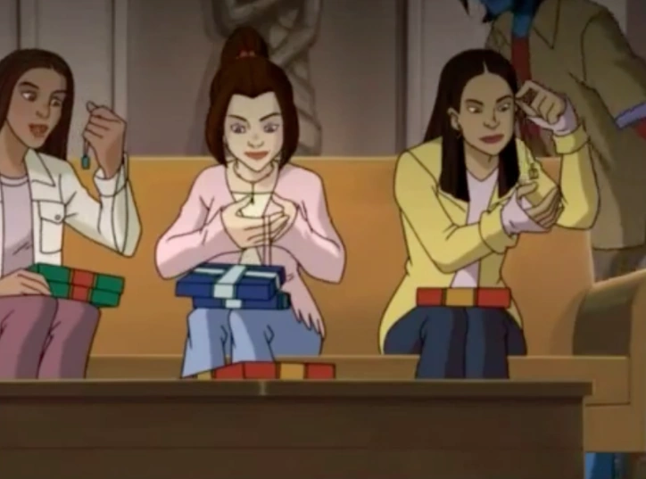 The whole incident is on the news later that night, and Jean and Amara decide to keep it a secret. A strange rock video like montage follows with the girls shopping, then dancing, then doing some vigilante crime fighting, more dancing Kitty and Rogue join the group, the girls all change into new costumes, then even more dancing, some more crime-fighting, and finally Risty watching them covertly and looking none to happy about the whole thing. A news cast tells about the new Bayville Sirens, and how they've cut the crime rate in half. Scott watches suspiciously. The music resumes with the girls walking slow-motion down the school hallway ala "Jawbreakers" and quite a few other teenage movies. Scott sees the girls walking together, he slaps himself in the head and realizes what's been going on.