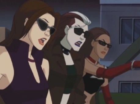 The girls track the car to a warehouse, where they get caught spying on a ring of car thieves; it's revealed that the whole thing was a setup by the ring to try and catch the Sirens, as they've been cutting into their business. The girls beat up the crooks in a Charlie's Angels-like fight scene. Tabitha gets a little too excited with her blasts and starts multiple fires. Nightcrawler and Cyclops hear the explosions and find the girls, but they wait it out on a catwalk above the fight. Nightcrawler asks him if they're going to help, but Cyclops wants to "let the girls handle it". Shadowcat, Magma and Jean trap the ring leader in the trunk of a car. Cyclops saves him by blasting the car away at the last minute as the car is about to be engulfed in flames. He tells Nightcrawler that he "never saw that".