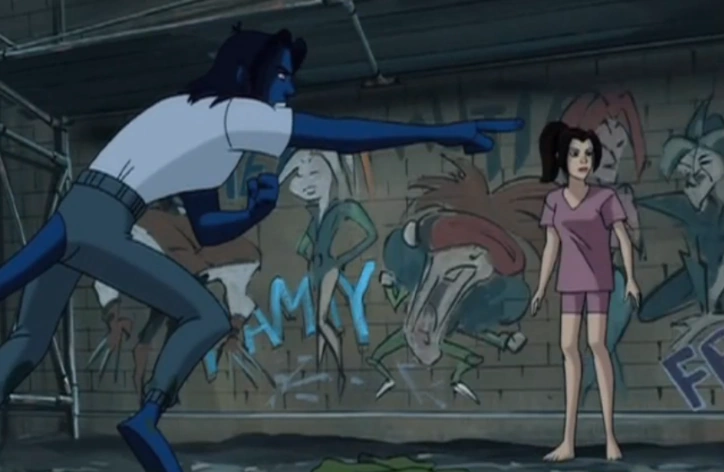 As they're leaving Kitty sees Kurt hiding behind a building. He was there the whole time but didn't step up to help Scott. He turns to leave, but some other kids are there and ask him if he isn't friends with the mutants. He tells them that he "used to be" and tries to get away, but Kitty and Rogue are right there behind him and heard the whole thing. Kitty tells him thanks, but Kurt rambles on about having to be somewhere and runs off.