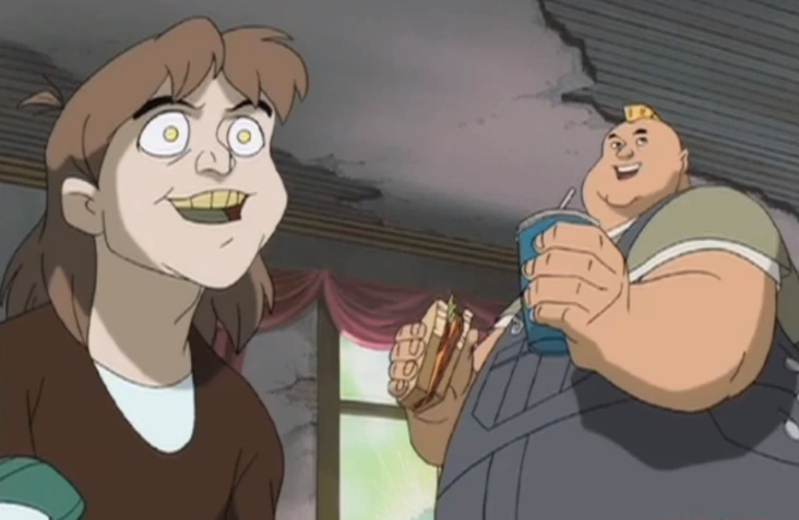 Back at the Brotherhood house, Tabitha busts in on Toad in the bathroom again (it's not seen, but implied that he was on the toilet). He tells her he's going to buy her some mouthwash. The Blob catches her on the stairs and yells at her for shaving his head bald during the night. She comments that she was wrong, he did look better with the mohawk as she heads downstairs. Tabitha tells the boys she'll see them later and proceeds to steals Lance's jeep again.