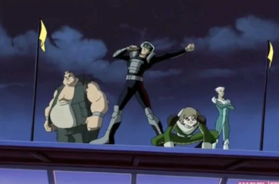 Blob, Avalanche, and Toad show up looking for Rogue. Scott is surprised that Rogue is working for Mystique. Avalanche asks who's side she's on and Rogue says that it's not her fight and leaves. The Brotherhood and X-Men fight over the gizmo. Jean and Scott put the Blob down. Avalanche knocks Kitty through a wall, but she phases back through and calls him a loser. Toad tries to get past Spyke and reach the gizmo, but Spyke puts up a wall of spikes and knocks him down.