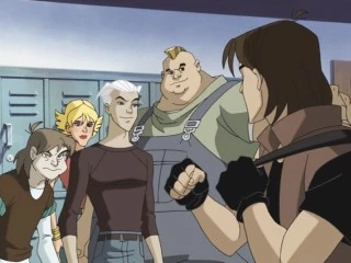 At high school, everyone is gathered in the gym for an assembly. On the floor of the gym, the Brotherhood are all standing/slouching against a wall. Todd is trying to caught a fly but fails, and he says that this sucks. Fred asks why they're even in school and Pietro says he knows what Lance is doing. They all look at Lance, but he's watching Kitty as she talks to some of her friends. Pietro says "He'd like to get a certain Kitty stuck in a tree. K-I-S-S-I-N..." The rest of the Brotherhood laugh as Lance tries to backhand Pietro, but he speeds out of the way to hide behind Fred and Todd gets hit instead.